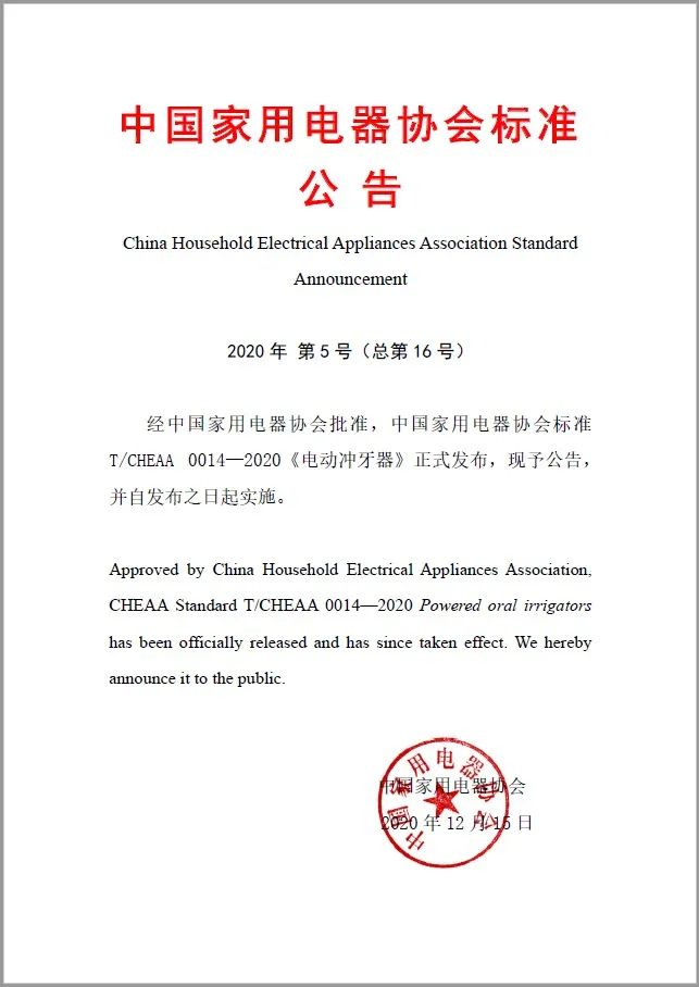 近日,由中国家用电器协会颁布的《电动冲牙器》(T/CHEAA 0014-2020)团体标准正式发布,并于2020年12月15日正式实施。该项团体标准填补了国内电动冲牙器行业标准的空白,利于促进行业有序发展,提升行业品质。